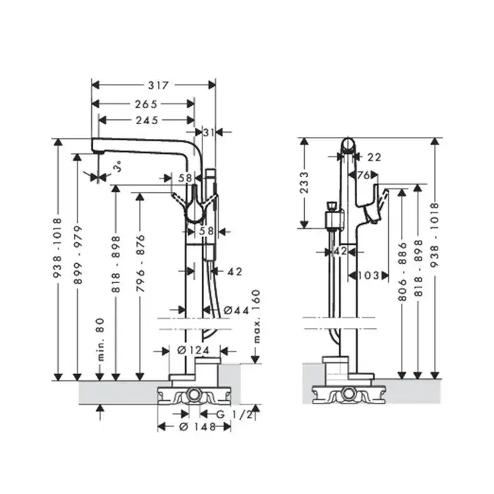 Hansgrohe Talis S Смеситель для ванны напольный однорычажный с изливом 24,5 см, отдельн. цвет: хром 72412000