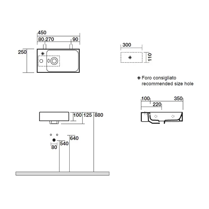 Kerasan Cento Раковина подвесная 25х45 см, с 1 отверстием под смеситель и переливом, цвет: Bianco 353701C*1