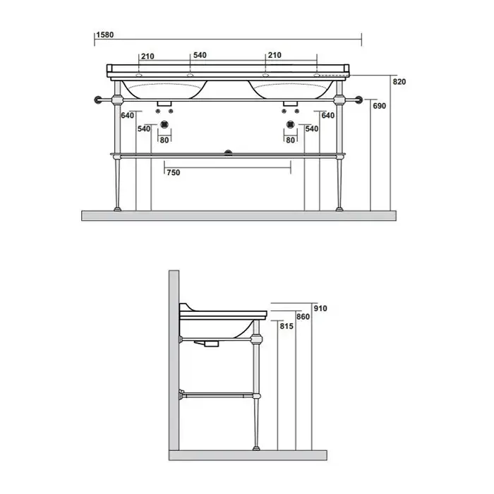 Kerasan Waldorf Раковина двойная 150x55 см, с 1 отв. под смес., с заглуш., цвет: Nero lucido/Cromo 4143K4 nero/cr *1