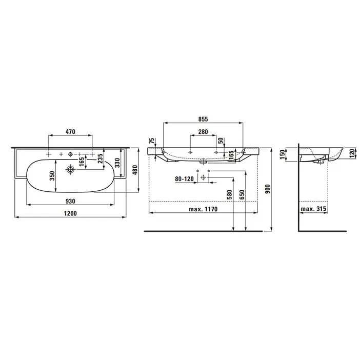 Laufen New Classic Раковина 120х48хh7,5 см, с 3 отв., под смес., цвет: белый мат. 8.1385.8.757.108.1