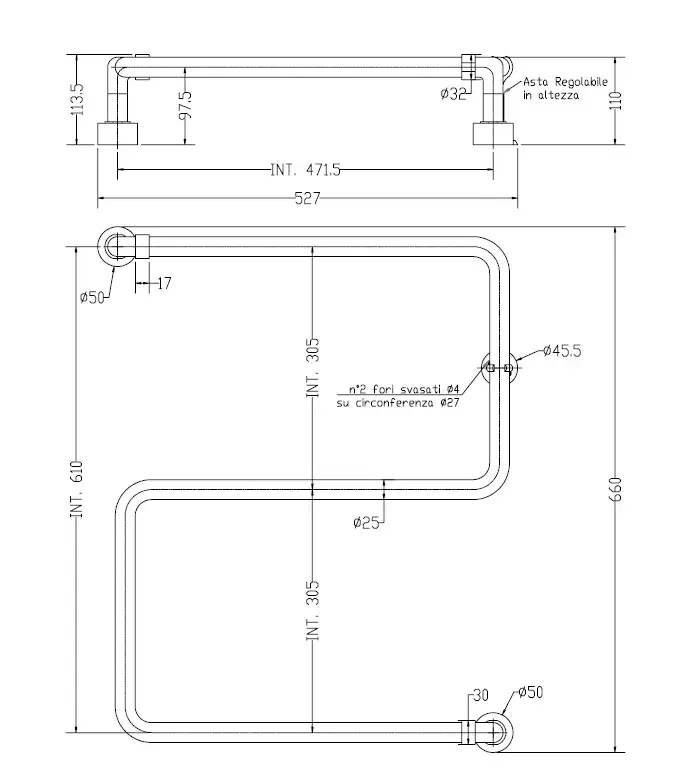 Margaroli Vento 500 Полотенцесушитель электр. поворотный 54,7х57,5h (53) нижнее, цвет: satin crome 500547SAB