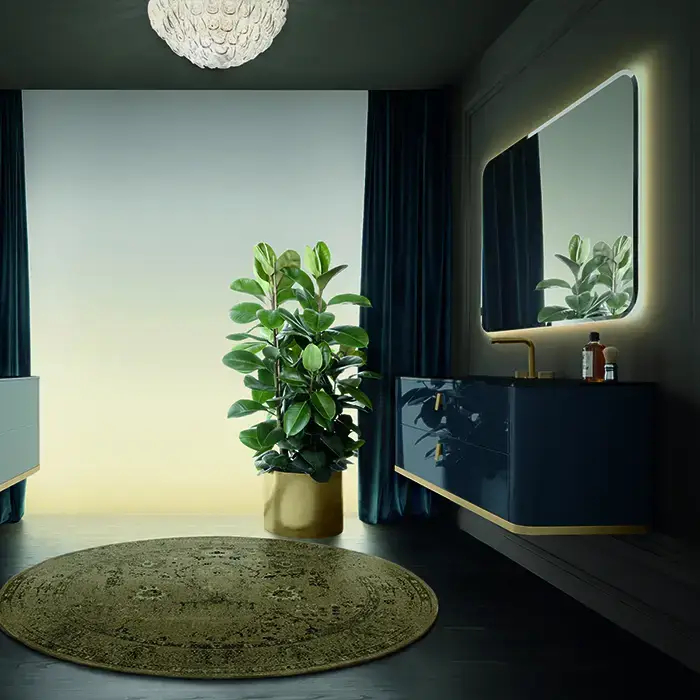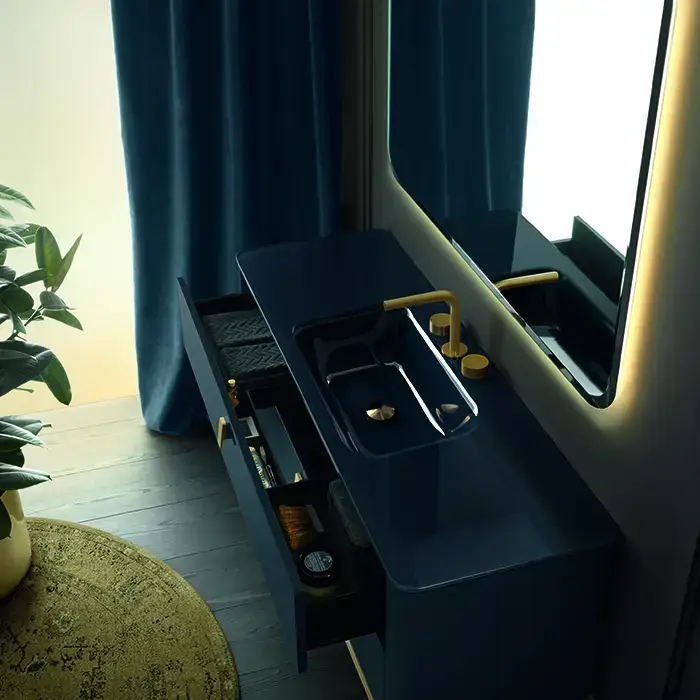 VITAGE milldue edition TAILOR Комплект мебели с базой, ручки сатинированное золото, интегрированной стеклянной раковиной ASPEN, зеркалом BEND с подсветкой, 141см, лак высокий глянец, подвесной, Цвет: zaffiro-137