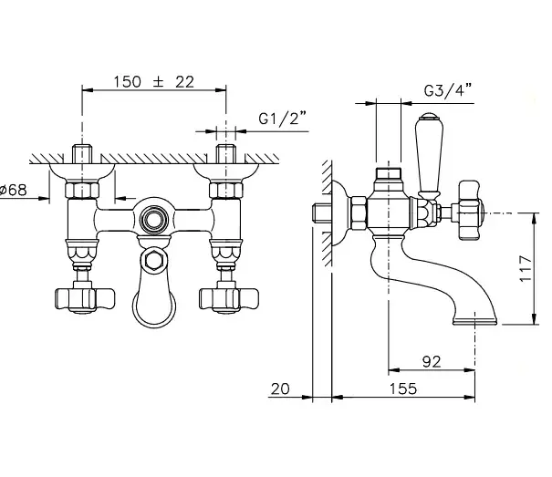 Nicolazzi Dames Anglaises Смеситель для ванны и душа, настенный, с 2мя ручками, цвет хром 1400CR70