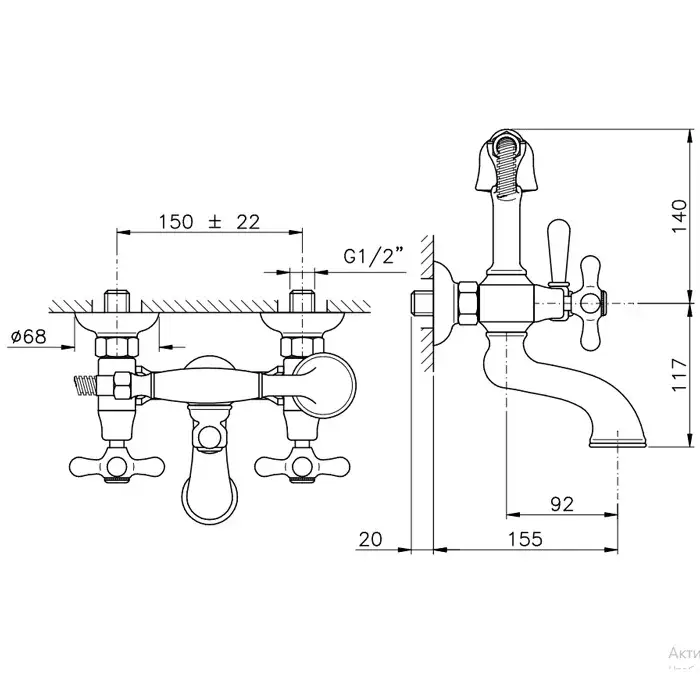 Nicolazzi Nuova Brenta Смеситель для ванны с 2мя ручками, настенный, цвет Gold Brass 2501GB