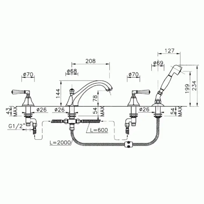 Nicolazzi Teide Смеситель на борт ванны, 4 отв., излив 22,3 см, с ручным душем, цвет хром 1904CR05