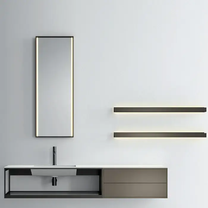 NOORTH milldue edition FJORD Комплект мебели 181.2см в матовом лаке, металле, стекле, с интегрированной раковиной из milltek solid, 2-мя полками с подсветкой, зеркалом с подсветкой подвесной, Цвет: castoro-11/bazalto-338/fumo