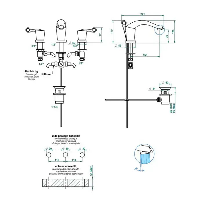 THG Bagatelle metal Смеситель для раковины, 3 отв., цвет: хром