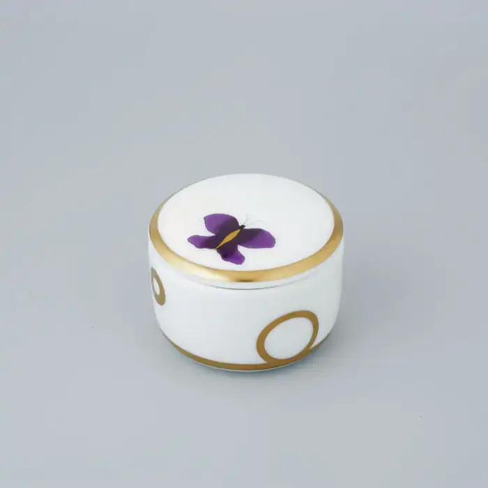 THG CAPUCINE MAUVE DECOR OR Китайская лакированная коробка с белой керамической крышкой Ø94 мм., small size, декор золото/лиловый, цвет: золото