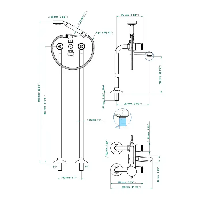 THG CORVAIR Смеситель для ванны напольный, с ручным душем и шлангом 1500 мм., цвет: полированное золото