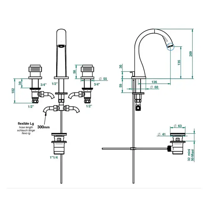 THG Diplomate Smooth Rings Смеситель для раковины на 3 отверстия, с донным клапаном, цвет: хром