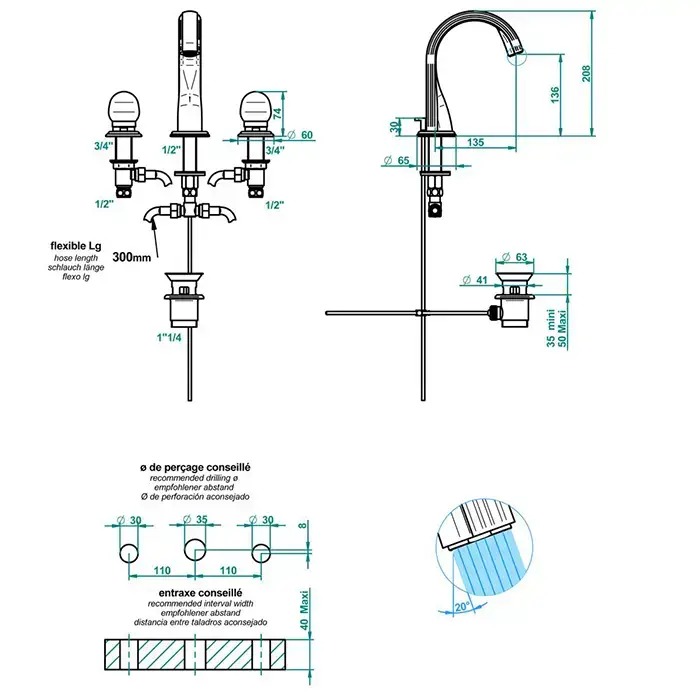 THG Dragon Jade Смеситель для раковины, 3 отв., цвет: золото/хрусталь
