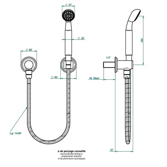THG Flore Душевой комплект с ручным душем, шланг 1500 мм., держатель и подвод воды, цвет: хром