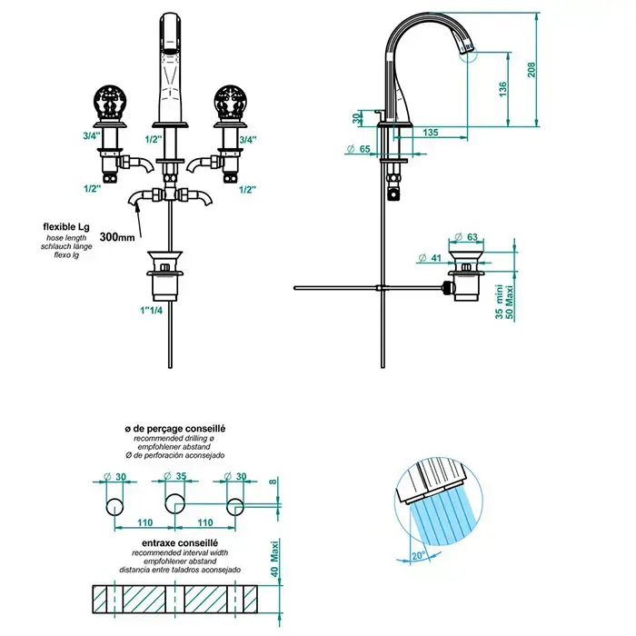 THG Flore Смеситель для раковины, 3 отв., цвет: хром/хрусталь