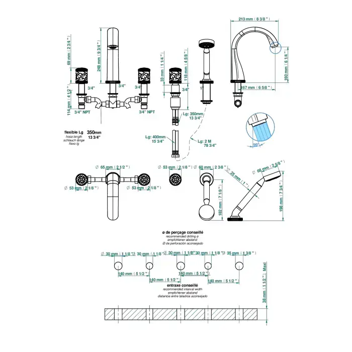 THG Hirondelles Platinum Stamped Смеситель на борт ванны, 5 отв., с ручным душем, цвет: Polished nickel