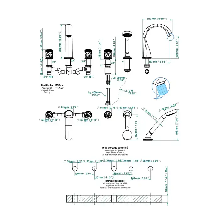 THG Hirondelles Смеситель на борт ванны, 5 отв., с ручным душем, цвет: Soft gold
