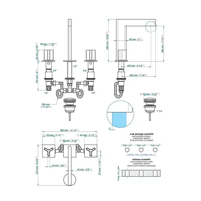 THG ICON-X TITANE Смеситель для раковины, 3 отв., с донным клапаном, цвет: хром