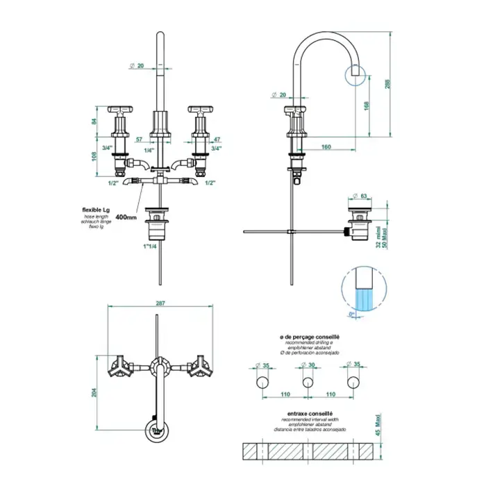 THG Les Ondes Смеситель для раковины, на 3 отв., цвет: Soft matt gold