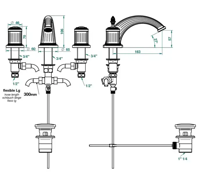 THG Malmaison metal Смеситель для раковины на 3 отверстия, с донным клапаном, цвет: полированное золото