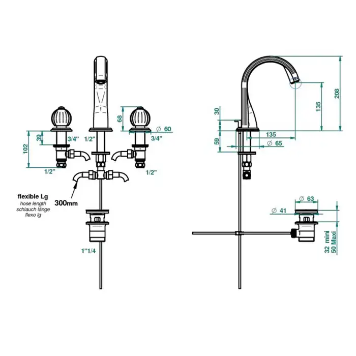 THG Mandarine metal Смеситель для раковины на 3 отверстия, с донным клапаном, цвет: хром