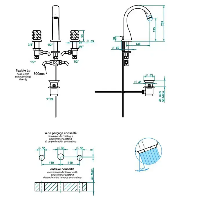 THG Mossi Смеситель для раковины, 3 отв., цвет: хром/прозрачный хрусталь