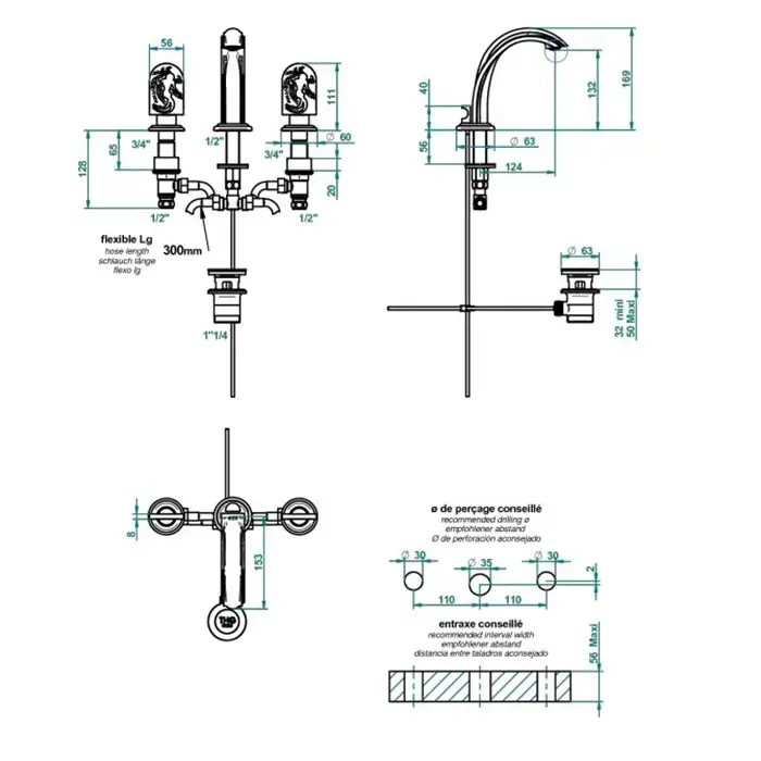 THG Naïade Смеситель для раковины, 3 отв., цвет: хром/прозрачный хрусталь