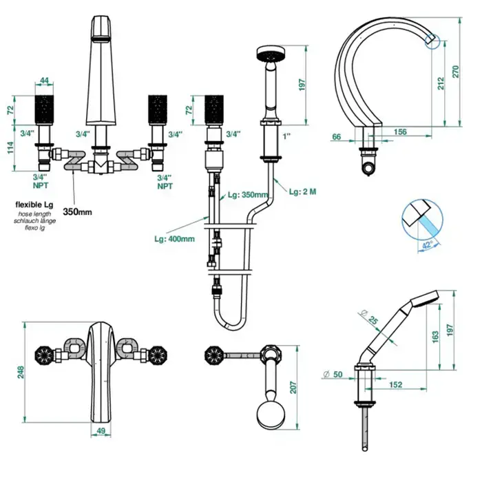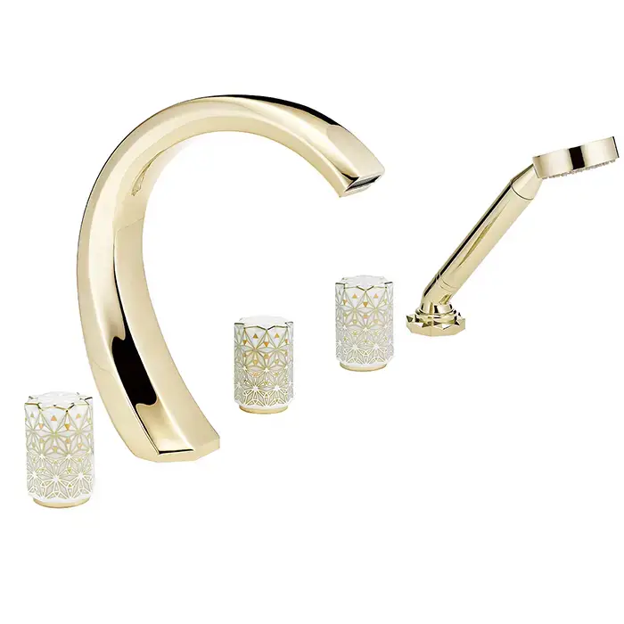 THG Nihal Porcelaine Ivoire Смеситель на борт ванны, на 5 отверстий, двойной, с ручным душем, цвет: Soft gold