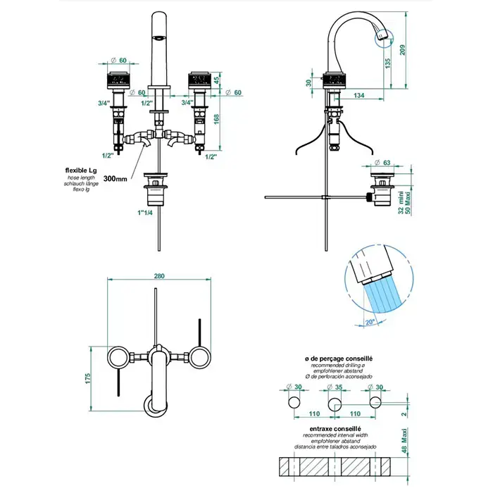 THG Paradise Смеситель для раковины на 3 отверстия, с донным клапаном, цвет: хром