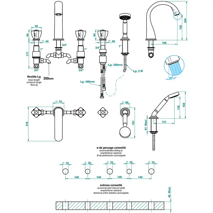 THG Petale de Cristal clair lisere dore Ручной душ на борт ванны, 2 отв., цвет: золото/прозрачный хрусталь с золотым декором
