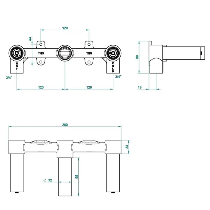 THG Встраиваемая часть смесителя настенного на 3 отверстия для ручек-рычагов
