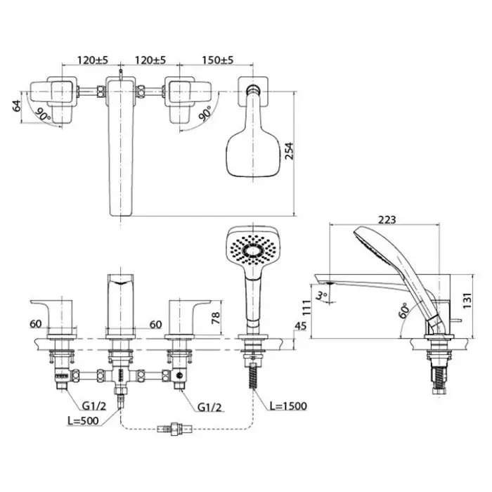Toto GE Смеситель на борт ванны, на 4 отв., с ручным душем, цвет: хром TBG07202R