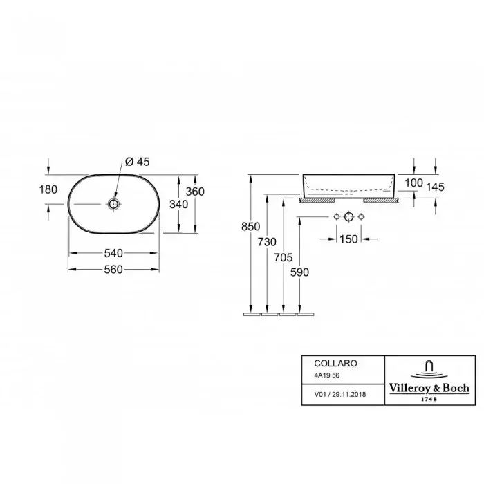 Villeroy & Boch Collaro Раковина чаша 56x36x14,5h см, без перелива, цвет: Альпийский белый глянцевый 4A195601
