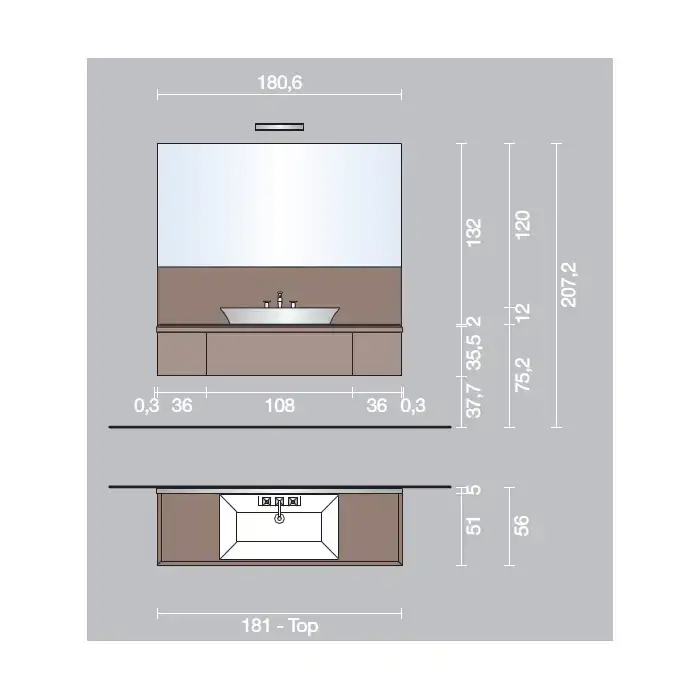 VITAGE milldue edition HILTON Тумба подвесная 180х56х32см, мраморная столешница с 2 раковинами, отделка: стекло twill smoke