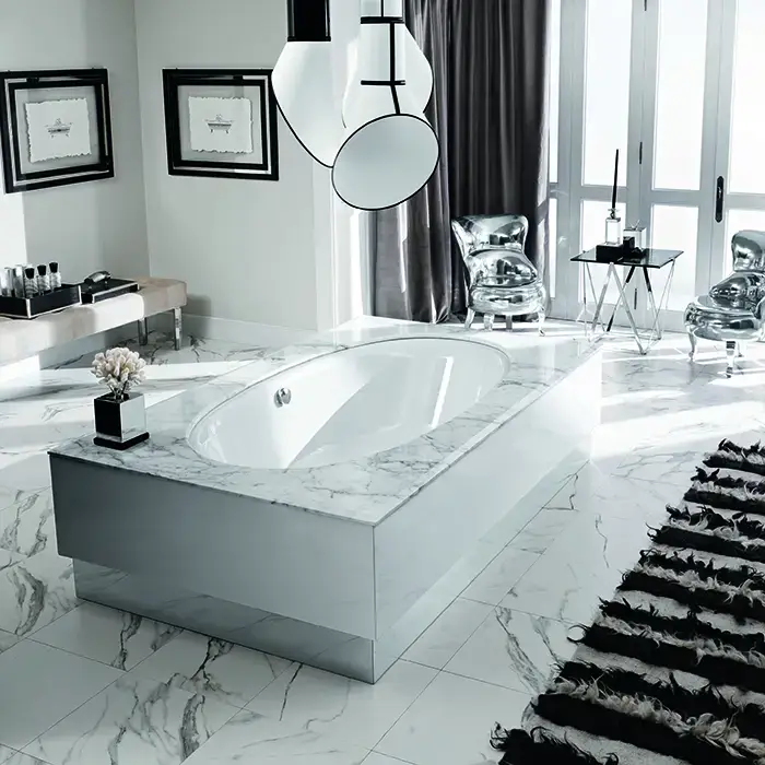 VITAGE milldue edition FOUR SEASONS Ванна 190х100 см, стальная, подача воды из крана, в комплекте с сифоном, основанием и мраморным топом, отдельностоящая, цвет: белый / Calacatta vagli