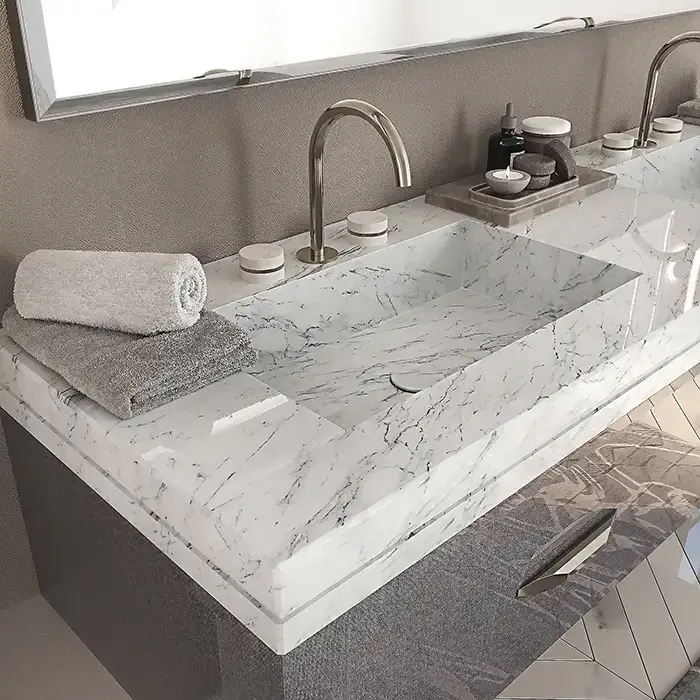 VITAGE milldue edition FOUR SEASONS Ванна 190х100 см, стальная, подача воды из крана, в комплекте с сифоном, основанием и мраморным топом, отдельностоящая, цвет: белый / Calacatta vagli