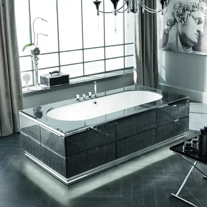 VITAGE milldue edition Ванна 190х100см, стальная, подача воды из водослива, в комплекте с сифоном, основанием и зеркальным топом, отдельностоящая, цвет: белый/Fumè